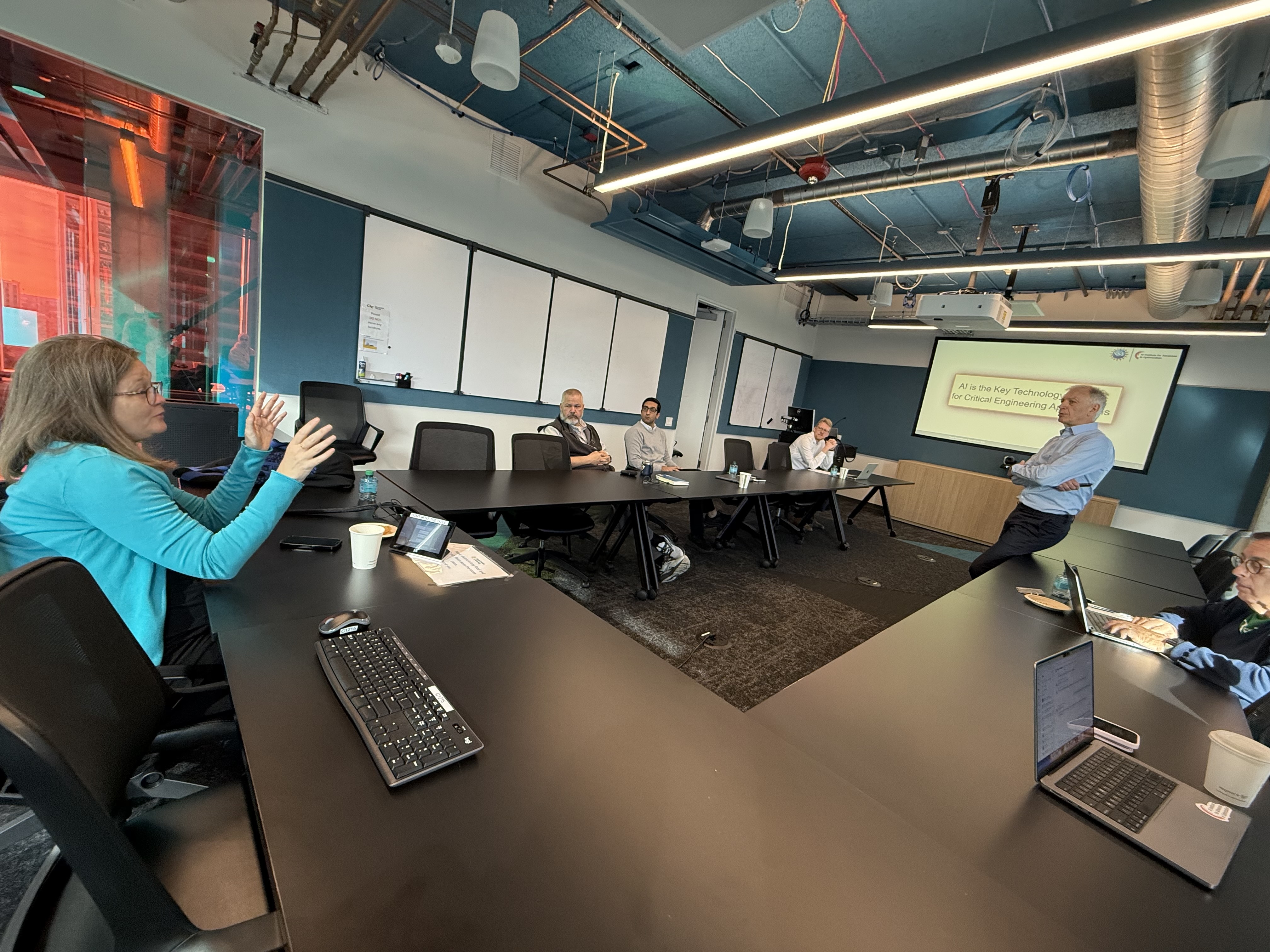 The visit began with flash talks from faculty and staff highlighting how AI is being applied across government, optimization, K–12 education, and healthcare, followed by an AI4OPT lab tour and student poster session.